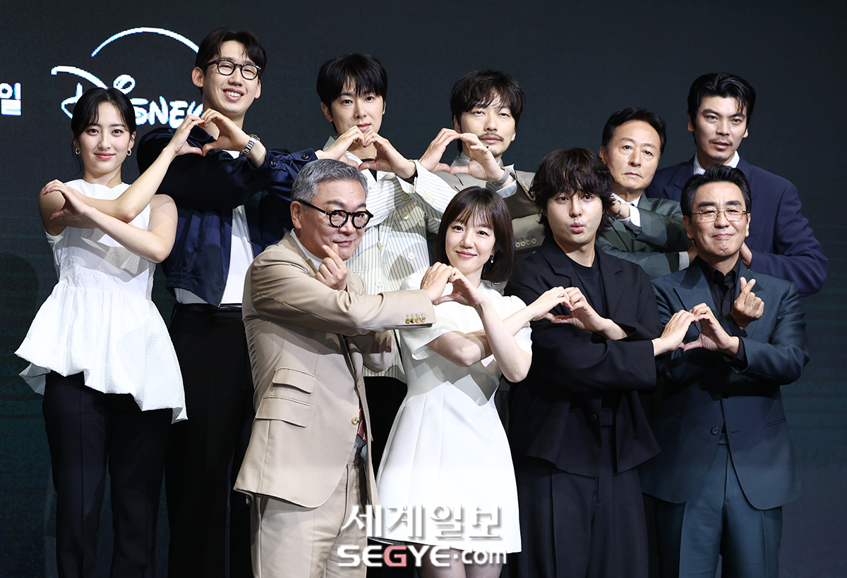 배우김민, 이상진, 유노윤호, 이동휘, 김종수, 김성오, 류승룡, 양세종, 임수정, 김의성(사진 왼쪽 위 시계방향)이 8일 서울 여의도 콘래드호텔에서 열린 디즈니+ 오리지널 시리즈 ‘파인: 촌뜨기들’ 제작발표회에 참석해 포즈를 취하고 있다.