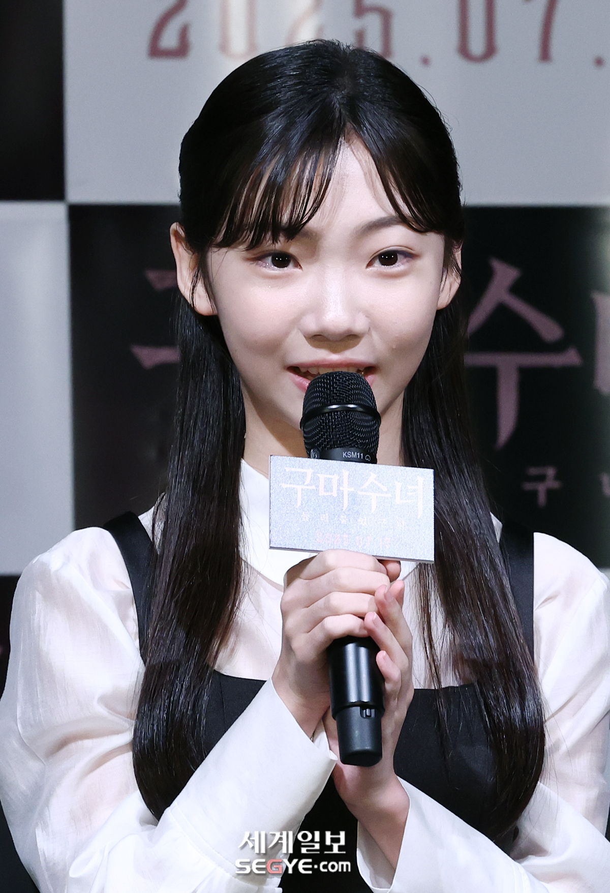 배우 김태연이 8일 서울 용산 CGV에서 열린 영화 ’구마수녀-들러붙었구나’의 언론시사회에 참석해 인사말을 하고 있다.