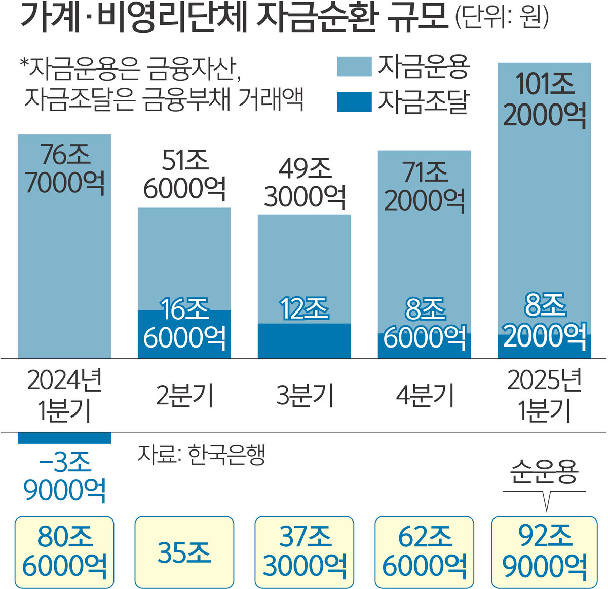 한국은행이 8일 공개한 ‘2025년 1분기 자금순환(잠정)’에 따르면 가계 및 비영리단체(개인사업자 포함)의 1분기 순자금운용액은 92조9000억원으로 2009년 관련 통계 편제 이후 가장 많은 것으로 집계됐다. 이는 직전 분기(62조6000억원)보다 30조원 이상 늘어난 것으로, 기존 최대 기록인 2023년 1분기(92조8000억원)보다 1000억원 많은 규모다.