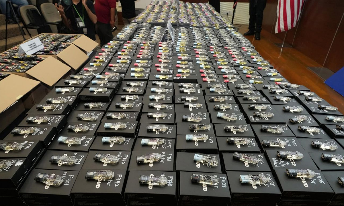 국가정보원 국제범죄정보센터(TCIC)는 신종마약 에토미데이트를 국내에 대량 밀반입하려 한 싱가포르인 국제마약조직 총책 등 일당 4명을 지난 6월 19일 말레이시아 마약범죄수사부(NCID)와 공조로 현지에서 검거했다고 8일 발표했다. 국정원과 현지 수사당국은 검거 과정에서 합성마약 카트리지 4천958개(9.42L)와 전자담배 포장용 종이박스 3천여개를 압수했다. 사진은 압수한 합성마약 카트리지. 국정원 제공