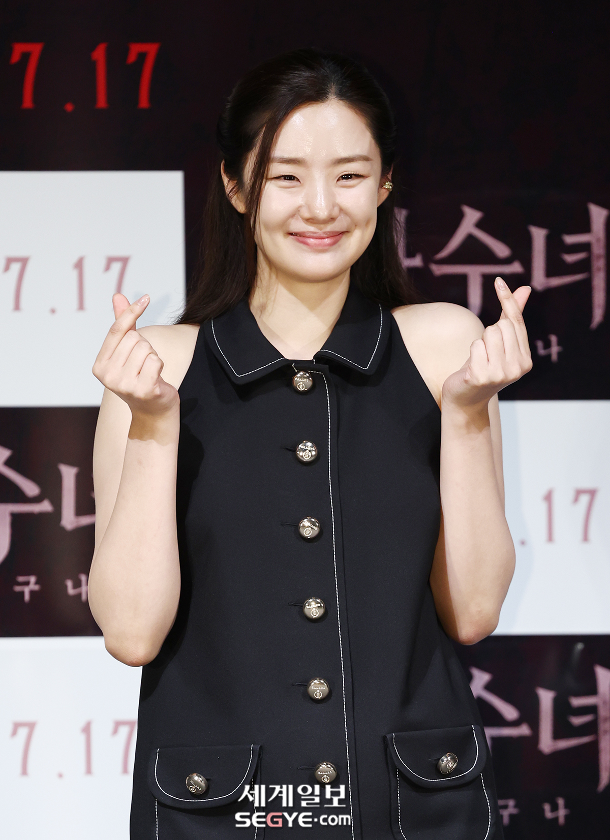 배우 스테파니 리가 8일 서울 용산 CGV에서 열린 영화 ’구마수녀-들러붙었구나’의 언론시사회에 참석해 포즈를 취하고 있다.