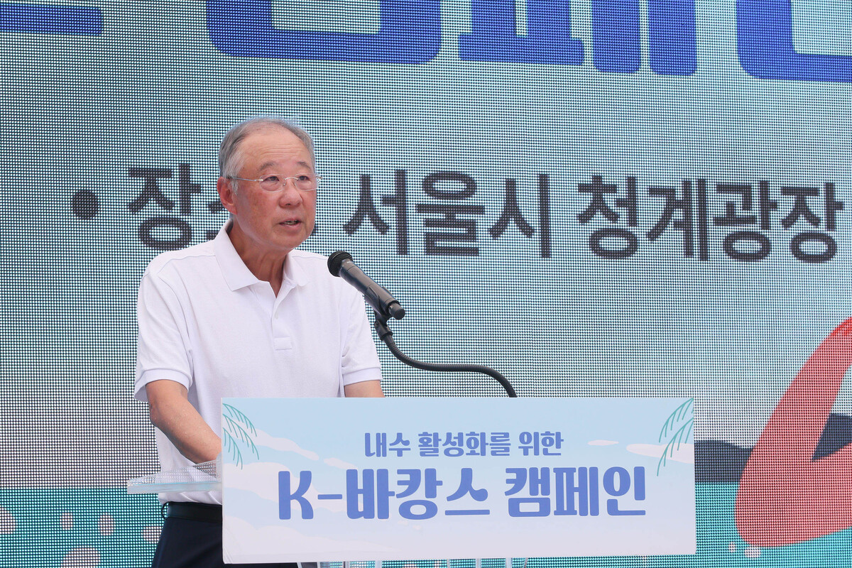 한국경제인협회(한경협) 류진 회장이 8일 서울 청계광장에서 국내 여행 활성화를 위한 ‘K-바캉스 캠페인’을 열고 국민들에 여름 휴가를 국내에서 보낼 것을 호소했다.