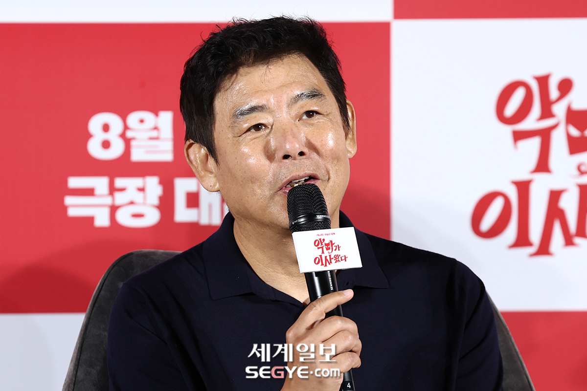 배우 성동일이 9일 서울 용산 CGV에서 열린 영화 ’악마가 이사왔다’의 제작발표회에 참석해 인사말을 하고 있다.