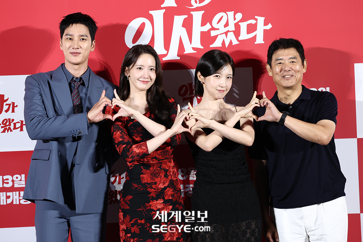 배우 안보현, 임윤아, 주현영, 성동일(사진 왼쪽부터)이 9일 서울 용산 CGV에서 열린 영화 ’악마가 이사왔다’의 제작발표회에 참석해 포즈를 취하고 있다.