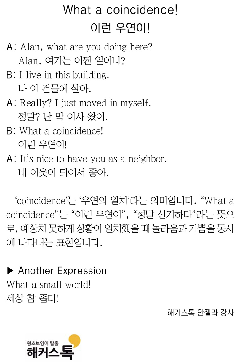 [해커스톡 일대일 영어회화] 하루 1분 기초 영어회화 말하기 (7월 10일) 입력 : 2025-07-10 09:00:00 수정 : 2025-07-09 18:19:03 구글 네이버 유튜브 What a coincidence! 이런 우연이! Copyright ⓒ 세계일보. 무단 전재 및 재배포 금지 세계일보