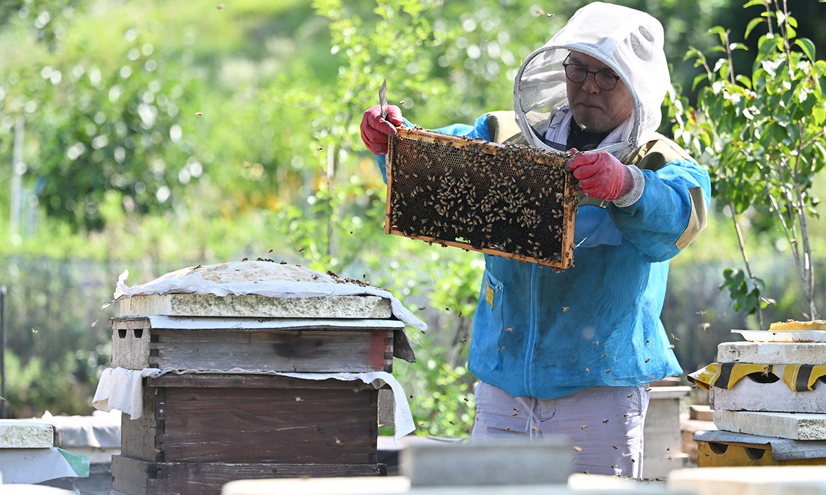 폭염 특보가 13일째 이어진 9일 광주 북구 장등동의 한 양봉장에서 양봉업자가 벌통을 검사하고 있다. 폭염 등 극한기후는 꿀벌 개체 수에도 적지 않은 영향을 미치는 것으로 알려졌다.