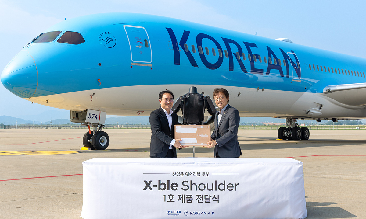 현대차·기아 로보틱스랩의 자체 기술로 개발한 엑스블 숄더는 반복적인 위 보기 작업 환경에서 근로자의 어깨 근력을 보조한다. 근골격계 부담을 줄여 작업자의 부상 위험을 낮추고, 작업 피로도를 경감해 생산성을 높인다. 무동력 토크 생성 구조로 설계돼 가볍고 충전할 필요가 없다. 대한항공은 지난해 11월 현대차·기아가 엑스블 숄더의 사업화 계획을 밝힌 후 1호 고객이 됐다. 대한항공은 항공우주사업본부의 군용기 및 민항기, 무인기, 도심항공교통(UAM), 우주 발사체, 스텔스 항공기 등을 조립·정비하는 현장에 엑스블 숄더를 우선 도입한다.