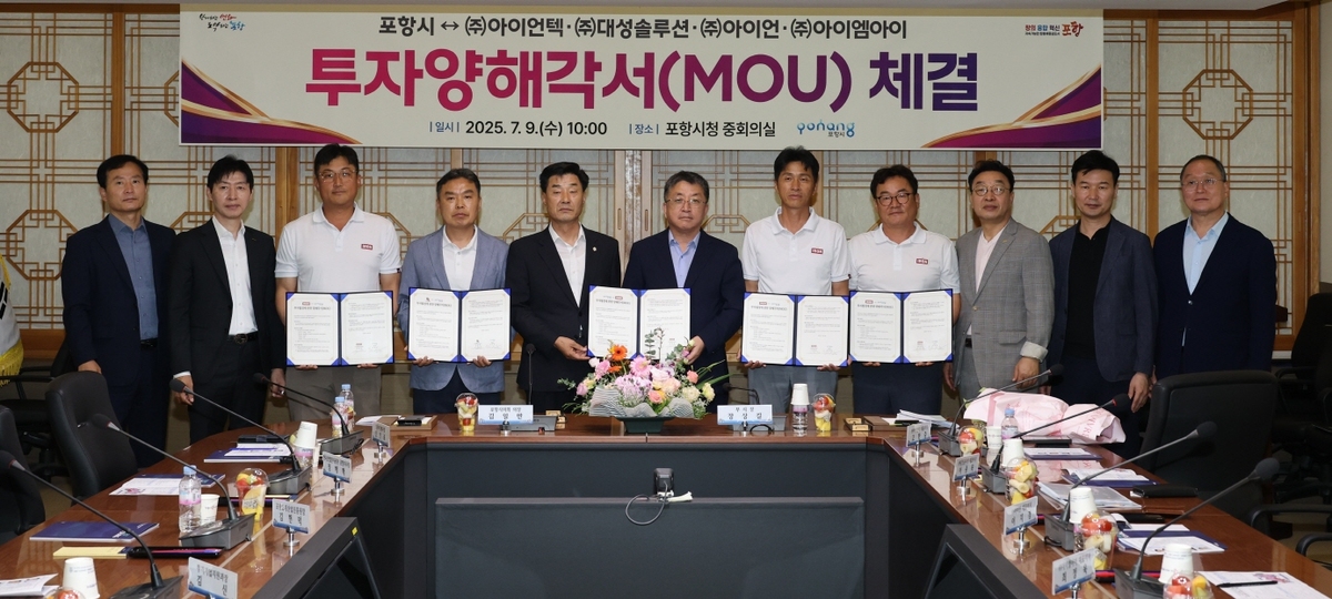 경북 포항시는 9일 시청 중회의실에서 지역 철강기업 4개 사(㈜아이언텍, ㈜대성솔루션, ㈜아이언, ㈜아이엠아이와 총 290억 원 규모의 투자양해각서를 체결했다고 밝혔다.