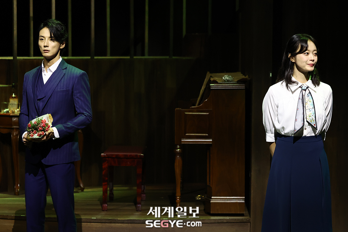 배우 윤시윤(사진 왼쪽)과 전소민이 10일 서울 강서구 LG아트센터 서울에서 열린 연극 ’사의 찬미’ 프레스콜에 참석해 열연하고 있다.