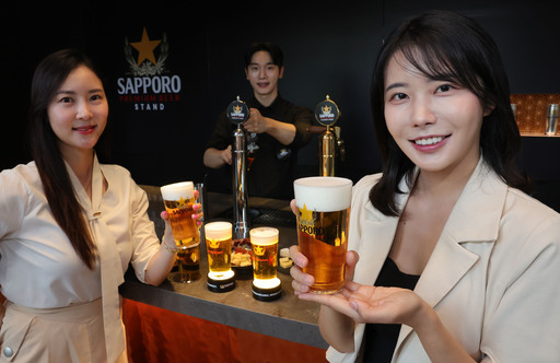 10일 서울 성동구 삿포로 맥주 최초의 해외 매장인 ‘삿포로 프리미엄 비어스탠드’에서 모델들이 맥주를 선보이고 있다. 일본 도쿄 핫플레이스인 긴자의 ‘삿포로 생맥주 블랙 라벨 더 바’를 재현해 12일 문을 연다.