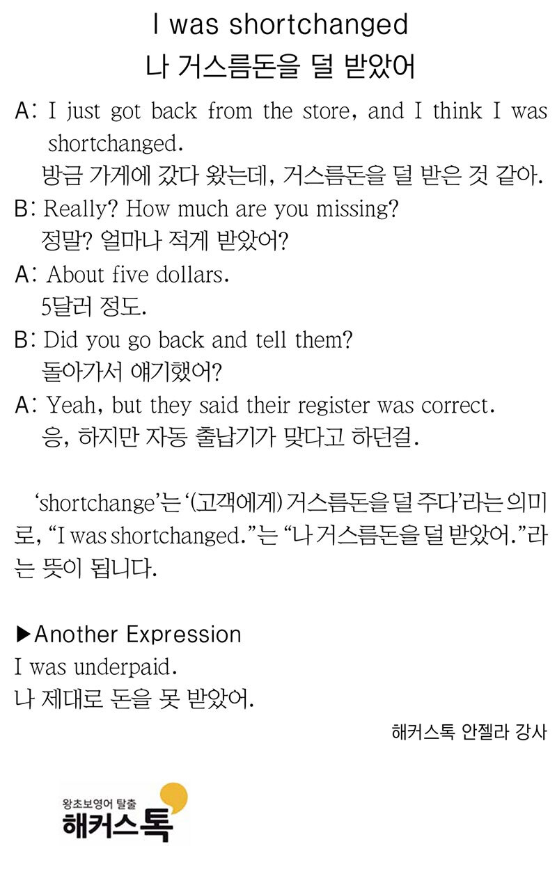 [해커스톡 일대일 영어회화] 하루 1분 기초 영어회화 말하기 (7월 11일) 입력 : 2025-07-11 09:00:00 수정 : 2025-07-10 18:12:41 구글 네이버 유튜브 I was shortchanged 나 거스름돈을 덜 받았어 Copyright ⓒ 세계일보. 무단 전재 및 재배포 금지 세계일보