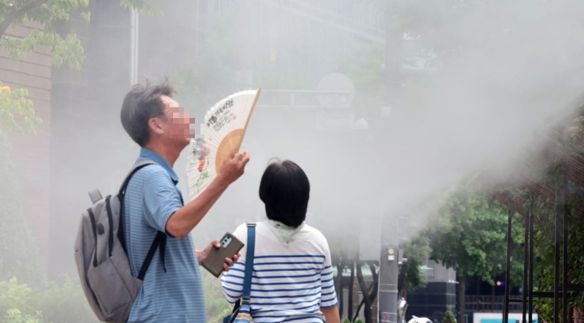 무더운 날씨에 한 시민이 서울광장 쿨링포그 앞에서 부채질을 하고 있다. 연합뉴스