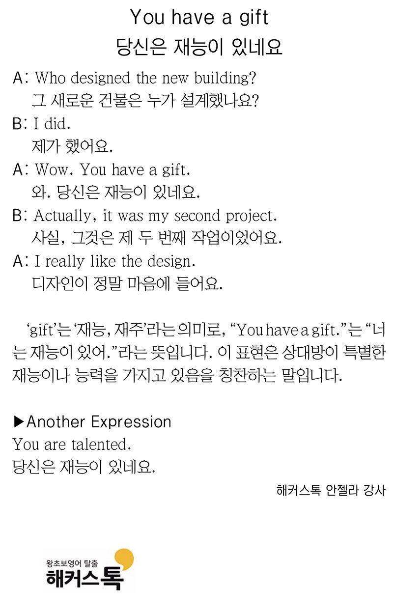 [해커스톡 일대일 영어회화] 하루 1분 기초 영어회화 말하기 (7월 14일) 입력 : 2025-07-14 09:00:00 수정 : 2025-07-13 18:03:27 구글 네이버 유튜브 You have a gift 당신은 재능이 있네요 Copyright ⓒ 세계일보. 무단 전재 및 재배포 금지 세계일보