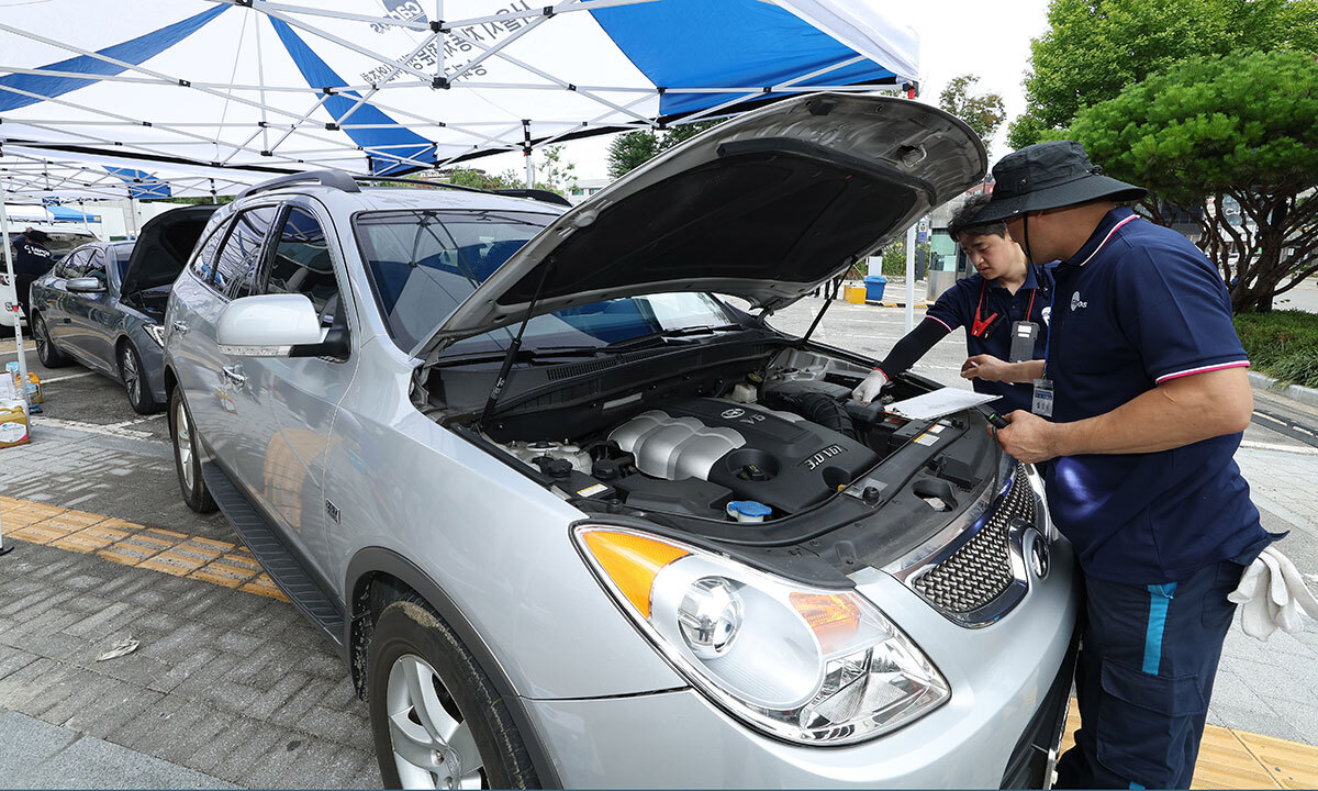 13일 서울 송파구 송파구민회관 지상주차장에서 서울시자동차전문정비사업조합 송파구지회 회원들이 휴가철을 앞두고 무상 안전점검 서비스를 받으러 온 차량들을 점검하고 있다. 점검 및 정비 항목은 엔진 이상 여부, 엔진오일 등 각종 오일류 점검 및 보충, 타이어 공기압 점검, 차량 전구류·워셔액·냉각수 점검 및 보충, 기타 차량 안전상태 점검 및 상담 등이다.