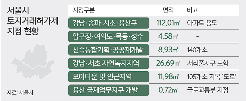 토허제란 특정 지역의 토지 거래 시 관할 구청장의 허가를 받도록 하는 제도다. 시에 따르면 시내 토허구역은 164.91㎢로, 전체 시 면적(605.24㎢)의 27.2%에 해당한다. 강남·서초·송파·용산구 전 지역에 압구정·여의도·목동·성수 등 주요 재건축 단지, 강남·서초 자연녹지지역, 잠·삼·대·청(강남구 삼성·대치·청담동, 송파구 잠실동) 재건축 14개 아파트 등이 포함돼 있다.
