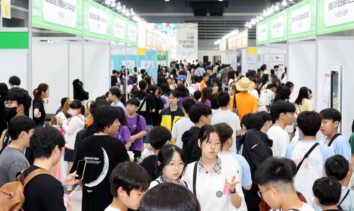2025 서울진로직업박람회가 개막한 16일 서울 서초구 양재동 aT센터 박람회장을 찾은 학생들이 다양한 직업 체험활동을 하고 있다. 올해로 22회를 맞는 이번 박람회는 약 4만 명이 참여할 것으로 예상되고 '가치를 담아 미래를 그리다'를 주제로 맞춤형 진로 프로그램을 제공한다.
