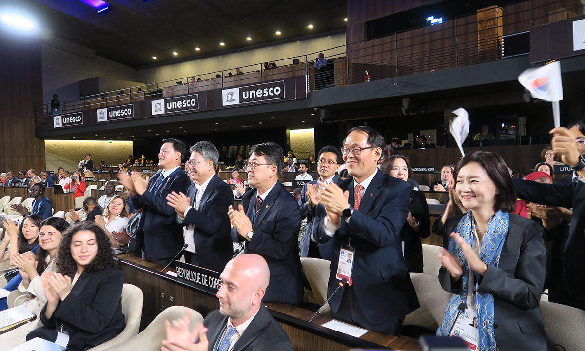환호 15일(현지시간) 프랑스 파리에서 열린 제47차 유네스코 세계유산위원회에서 차기 세계유산위원회 개최지로 대한민국이 확정되자 최응천 국가유산청장(왼쪽 세 번째)을 비롯한 정부 대표단이 자리에서 일어나 박수를 치고 있다. 국가유산청 제공