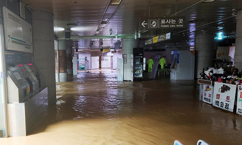 호우 특보가 발효된 17일 광주 서구 마륵동 상무역사가 빗물에 잠겨 있다. 연합뉴스