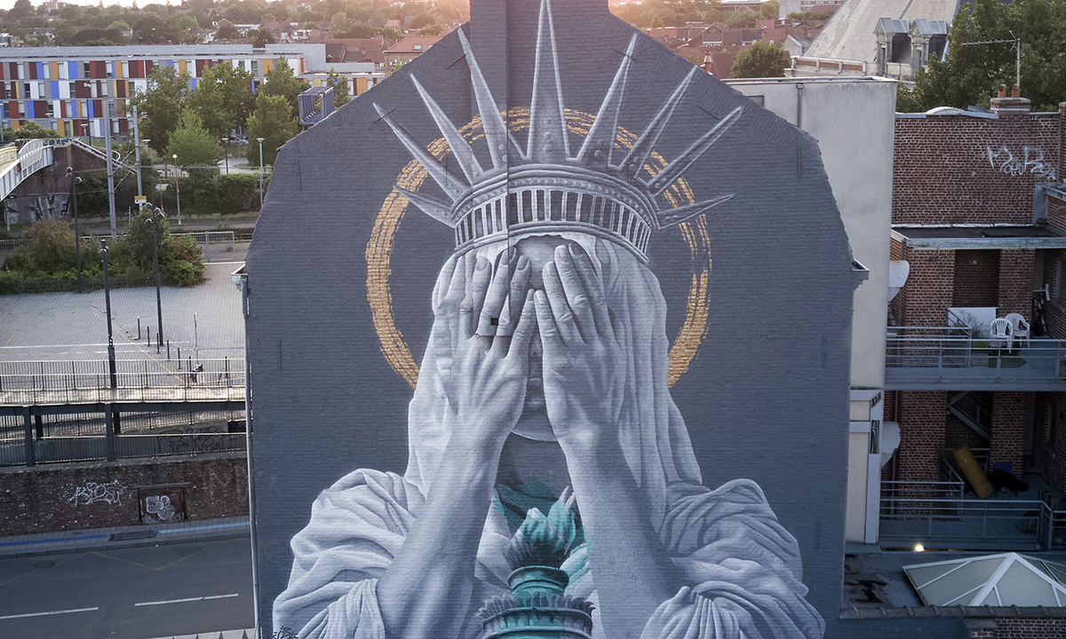 프랑스 북부에 있는 이민자 도시 루베의 어느 건물 외벽에 미국 뉴욕 자유의 여신상을 패러디한 대형 벽화가 그려져 있다. 자유의 여신이 양손을 들어 두 눈을 가리고 있는 모습이다. AP연합뉴스