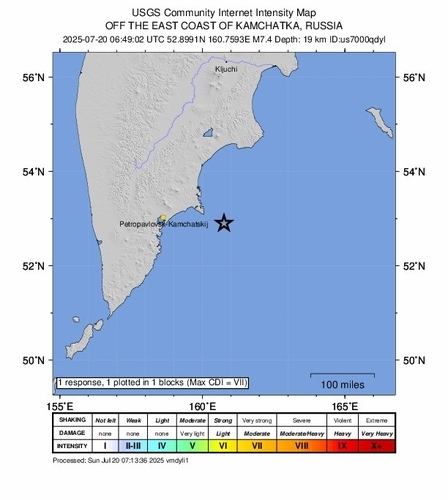 20일 오후 3시 49분(한국시간) 러시아 캄차카 반도 페트로파블롭스크-캄차츠키 동쪽 144km 해역에서 규모 7.4의 지진이 발생했다고 미국 지질조사국(USGS)이 밝혔다.