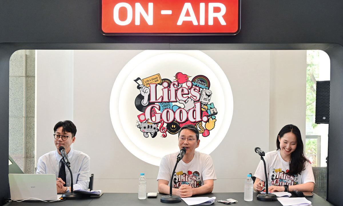 조주완 LG전자 최고경영자(가운데)가 지난달 23일 서울 여의도 LG트윈타워에서 열린 ‘라이프스굿 온 에어’ 행사에서 라디오 DJ로 참여하고 있다. LG전자 제공
