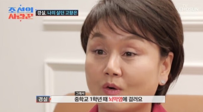 이경실은 “수업료를 못 내서 선생님에게 구박받았는데 너무 자존심이 상했다”며 “그래서 가난과 스트레스로 중학교 1학년 때 뇌막염이 걸렸다”고 밝혔다.