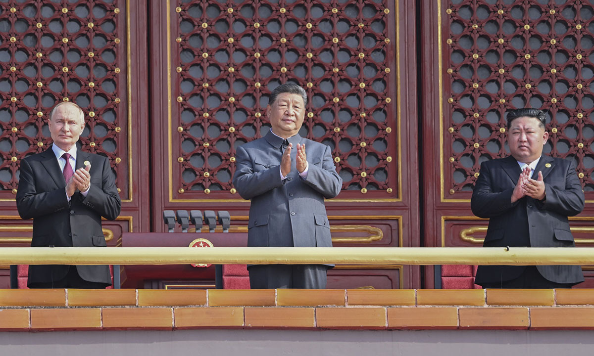 (250903) -- BEIJING, Sept. 3, 2025 (Xinhua) -- Chinese President Xi Jinping, also general secretary of the Communist Party of China Central Committee and chairman of the Central Military Commission, attends a grand gathering to commemorate the 80th anniversary of the victory in the Chinese People's War of Resistance against Japanese Aggression and the World Anti-Fascist War, along with other foreign leaders on Tian'anmen Rostrum in Beijing, capital of China, Sept. 3, 2025. (Xinhua/Rao Aimin)
