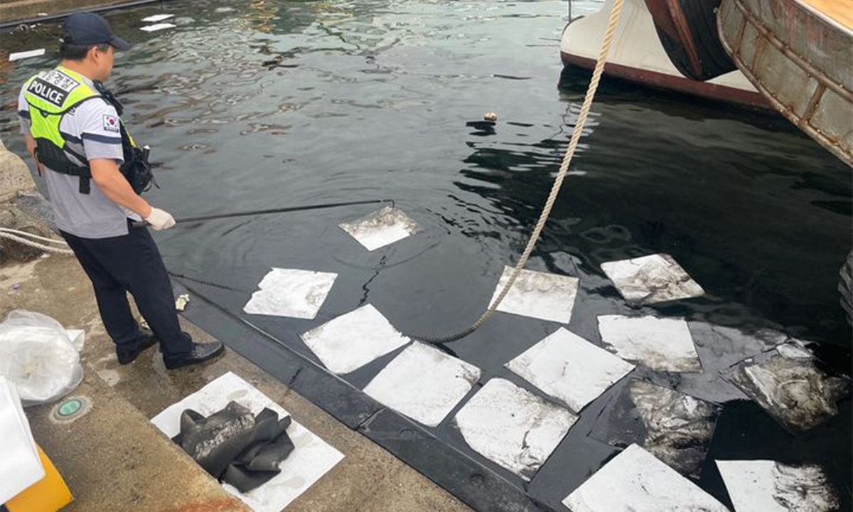 해경은 이틀에 걸쳐 유흡착재 약 400㎏을 투입해 방제를 마치고 유출 원인을 규명하기 위해 시료를 채취했다.