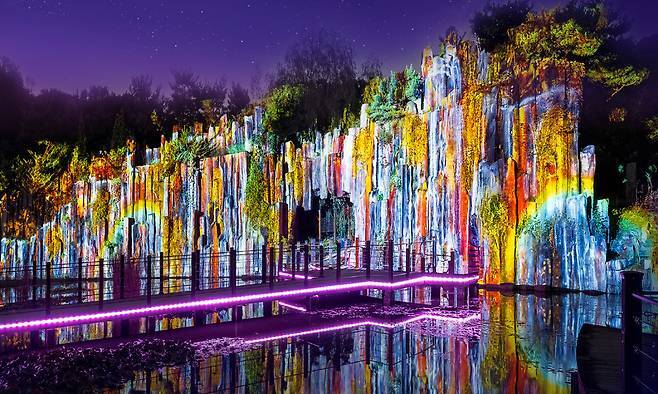 출발점인 기상낙원의 경우 절리폭포 동선을 활용한 프리쇼 구간으로 대형 미디어월에 영상이 펼쳐지며 이야기 속으로 초대한다. 이어 레이저 조명으로 만들어진 빛줄기가 비처럼 내리고, 잠시 뒤 연못 위 커다란 달이 낭만을 더한다. 끝 지점에서는 음악에 맞춰 형형색색의 유성이 데크길 위로 쏟아지며 마무리된다.