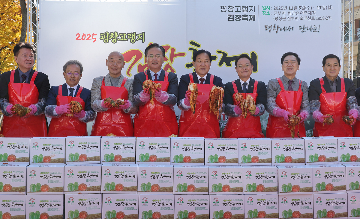 3일 서울 여의도 국회 소통관 앞 야외 광장에서 열린 '2025 평창고랭지김장축제 국회 시식회 및 평창 농산물전'에서 유상범 국민의힘 의원과 심재국 평창군수를 비롯한 참석자들이 김장김치를 담그고 있다.