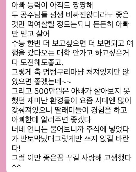 메시지에서 아버지는 “소중한 막내딸, 성적 안 나왔다고 좌절하지 마라. 아빠가 돈 버는 이유는 너희 두 공주님 때문이고 아직 능력 짱짱하다”면서 “평생 비싼 건 아니더라도 좋은 것만 먹일 수 있다. 아빠만 믿고 살아라”고 다독였다.