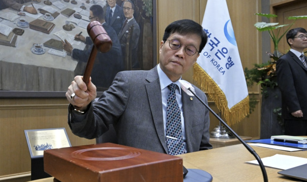 이창용 한국은행 총재가 27일 오전 서울 중구 한국은행 본관에서 열린 금융통화위원회 본회의에서 의사봉을 두드리고 있다. 뉴스1