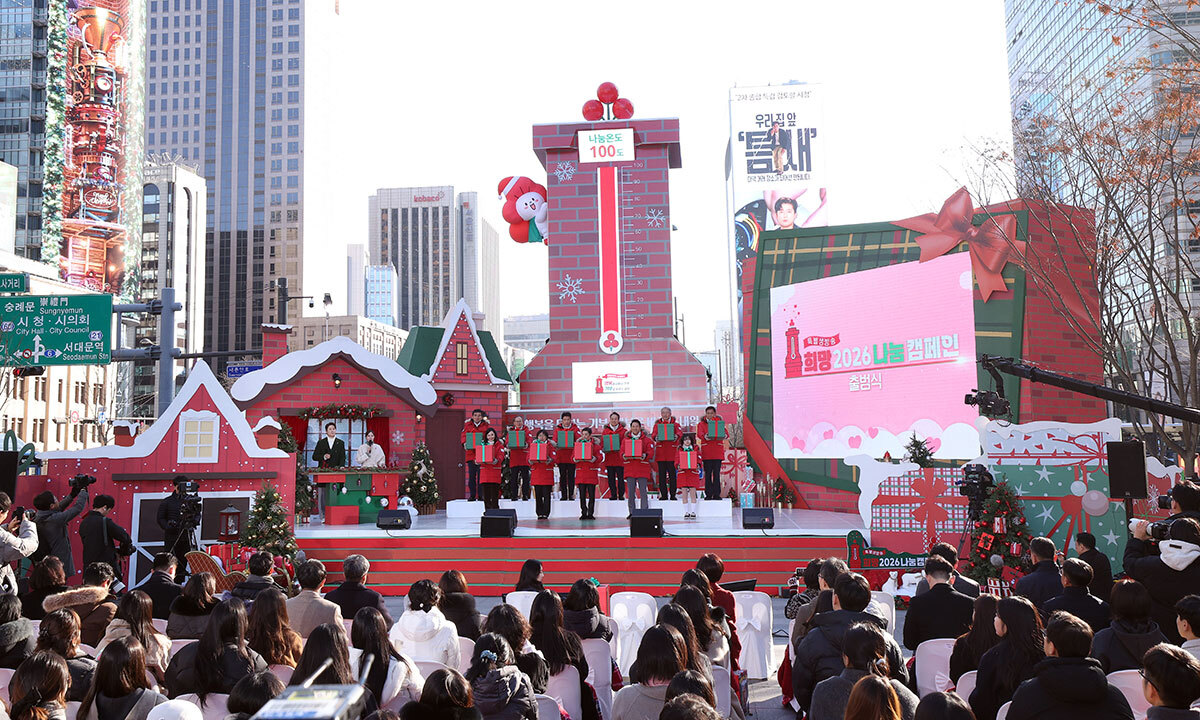 사랑의열매 사회복지공동모금회가 1일 서울 종로구 광화문광장에서 개최한 ‘희망2026나눔캠페인’ 출범식 및 사랑의온도탑 점등식에서 김병준 사랑의 열매 회장(앞줄 왼쪽 세번째), 오세훈 서울시장(앞줄 왼쪽 네번째) 등 참석자들이 점등 퍼포먼스를 하고 있다. 내년 1월31일까지 전국에서 일제히 캠페인이 전개되며, 목표 모금액은 4500억원이다.