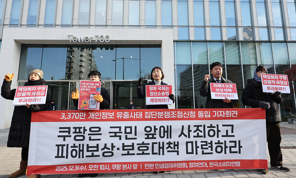 뿔난 시민단체… “분쟁조정 신청할 것” 입력 : 2025-12-04 01:29:48 수정 : 2025-12-04 01:29:47 구글 네이버 유튜브 민주사회를 위한 변호사모임 민생경제위원회, 참여연대 등 시민단체 관계자들이 3일 서울 송파구 쿠팡 본사 앞에서 쿠팡 경영진의 사과와 책임을 촉구하는 구호를 외치고 있다. 3370만명 고객 정보가 유출된 쿠팡을 상대로 대규모 집단소송 움직임이 본격화하면서 시민단체들도 피해자들을 모아 분쟁조정을 신청하기로 했다. <연합>연합> Copyright ⓒ 세계일보. 무단 전재 및 재배포 금지 연합