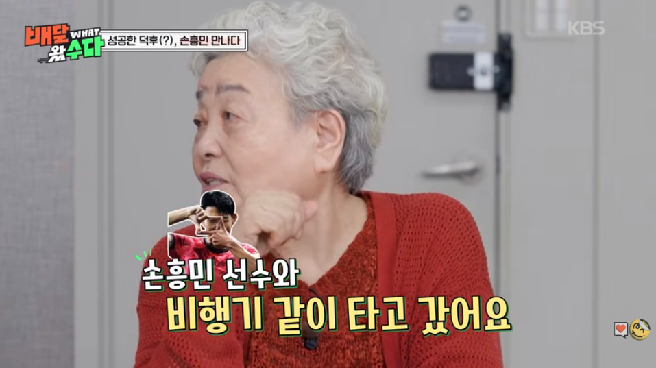 방송에서 강부자는 “이번 여름에 미국 갈 때 손흥민 선수와 같은 비행기를 탔다”고 말하며 비행기에서 함께 찍은 사진도 공개했다. 이어 “나는 비즈니스석에 탔는데 손흥민 선수는 일등석에 탔다. 커튼 하나 차이”라고 너스레를 떨어 웃음을 자아냈다.