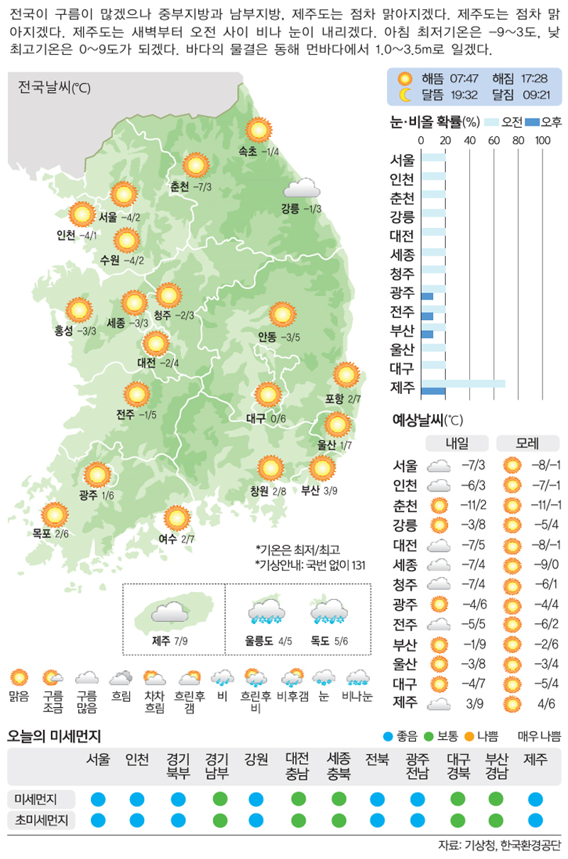 [5일의 날씨] 덜 매서운 소한 입력 : 2026-01-04 18:26:55 수정 : 2026-01-04 21:25:09 구글 네이버 유튜브 Copyright ⓒ 세계일보. 무단 전재 및 재배포 금지 세계일보 이슈 나우 더보기 서현, 롯데콘서트홀 '특혜 논란'에 현직 교수 "시대착오적" 일침 김광규, '빈잔' 듣고 눈물… "전세사기에 돈 전부 잃어, 병원비도 없었다"