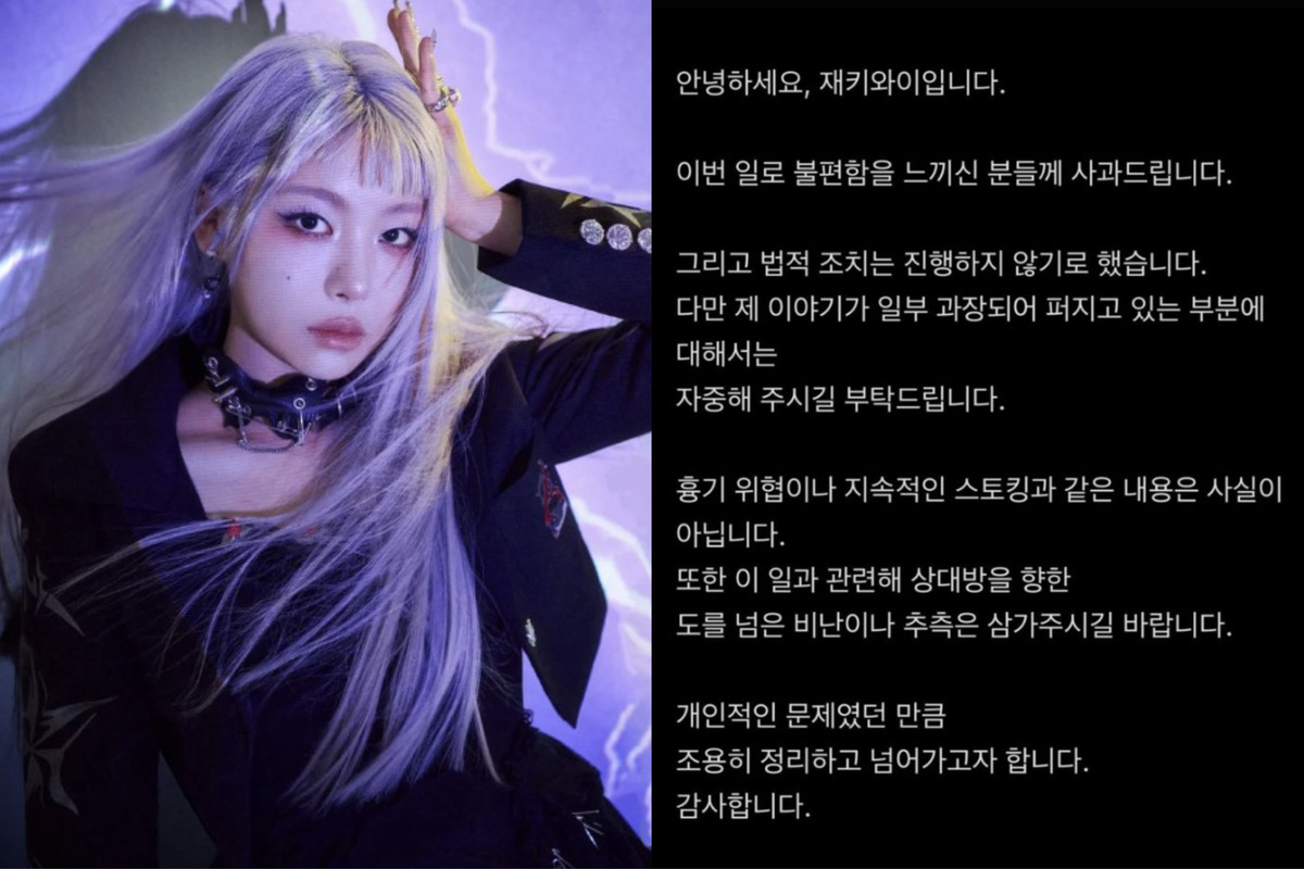 지난 7일 재키와이는 자신의 사회관계망서비스(SNS)에 “이번 일로 불편함을 느끼신 분들께 사과드린다. 그리고 법적 조치는 진행하지 않기로 했다”라면서 “다만 제 이야기가 일부 과장되어 퍼지고 있는 부분에 대해서는 자중해 주시길 부탁드린다”고 적었다.
