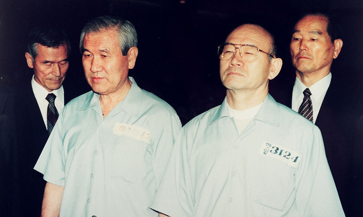 12·12 군사 반란 및 5·18 광주 민주화운동 유혈 진압 사건으로 구속기소된 노태우(왼쪽), 전두환 두 전직 대통령이 1996년 법정에 출석한 모습. 세계일보 자료사진