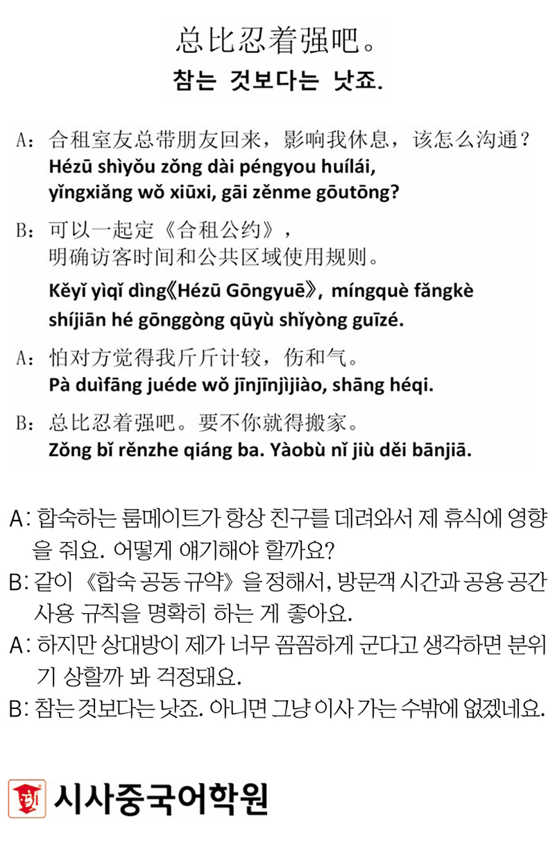 [시사중국어학원의 리얼 중국어 회화] 참는 것보다는 낫죠. 입력 : 2026-02-01 18:12:01 수정 : 2026-02-01 18:12:00 구글 네이버 유튜브 Copyright ⓒ 세계일보. 무단 전재 및 재배포 금지 세계일보 이슈 나우 더보기 “24년 전 오디션 꼬마가 대표로”… 수영, 일본 ‘프듀 신세계’ 연다… 한일 가요계의 ‘압도적 금의환향’ 박상면 "의정부 형님, 남양주 동생…" 수상소감에 동네만 읊은 사연