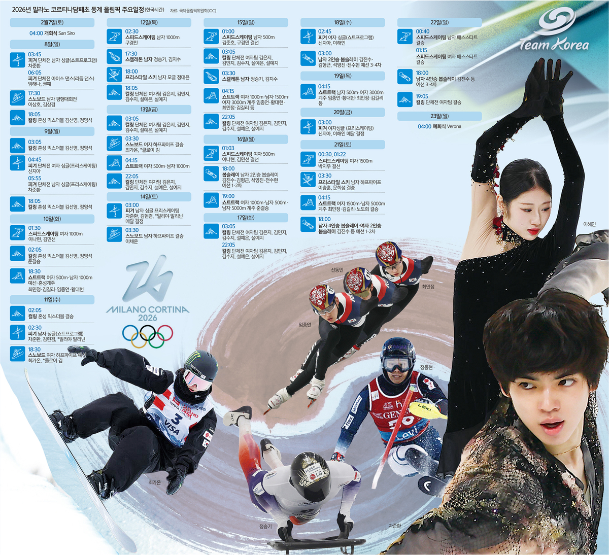 총 14개의 금메달이 걸린 빙속에서도 메달을 기대한다. 여자 단거리 ‘투톱’ 김민선(26·의정부시청)과 이나현(20·한국체대)은 16일 주 종목인 여자 500m에 출전한다. 2025~2026시즌 세계 신기록을 세운 펨케 콕(네덜란드)이 강력한 우승 후보로 꼽히지만, 당일 컨디션에 따라 메달 색깔이 갈릴 수 있다. 2018 평창 팀추월 은메달, 2022 베이징 매스스타트 은메달의 정재원(24·강원도청)은 세 번째 올림픽에서도 메달 사냥에 나선다. 평창 대회 팀추월 8위, 베이징 대회 매스스타트 결승 진출 실패로 아쉬움을 남겼던 여자 장거리의 박지우(27·강원도청)도 생애 세 번째 올림픽에서 기어코 메달을 따내겠다는 의지가 강하다.