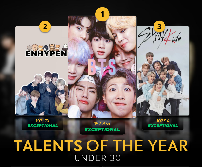 6일 글로벌 콘텐츠 분석업체 패럿 애널리틱스의 ‘30세 이하 올해의 인물(Talents of the Year Under 30)’ 명단에 따르면 방탄소년단은 1위, 엔하이픈과 스트레이 키즈는 각각 2위와 3위를 차지했다.