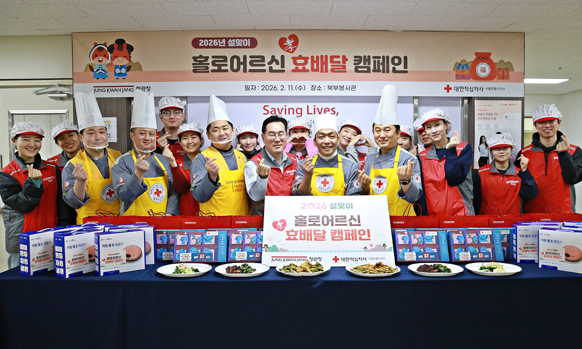 정관장 임직원들은 설 명절을 앞둔 지난 11일 서울 노원구 대한적십자사 북부봉사관을 직접 방문해 홀로 지내는 어르신들에게 전과 나물 등 명절 음식을 직접 대접하는 ‘효배달’ 캠페인을 진행했다. 2021년 추석부터 시작된 효배달 캠페인은 올해 설로 10회째를 맞았으며 그동안 약 1만2000명 어르신에게 건강과 온기를 전했다.