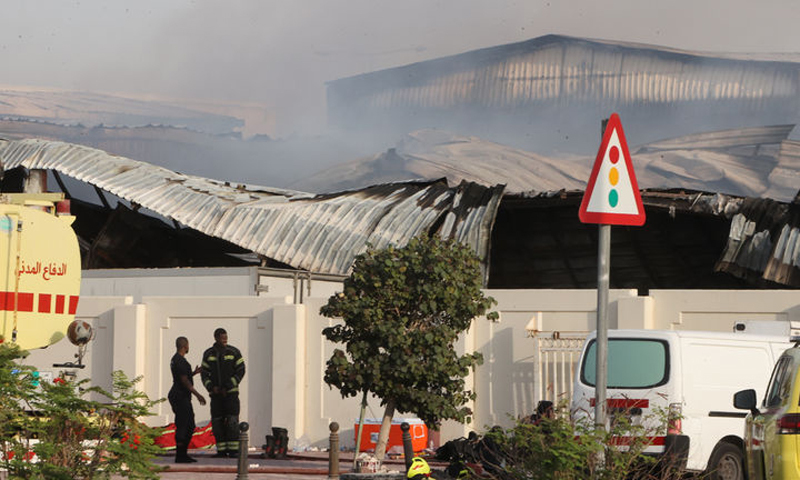 지난 1일(현지 시간) 카타르 알라이얀 산업단지에서 소방관들이 이란의 공습으로 파손된 창고 화재를 진화하고 있다. AP뉴시스