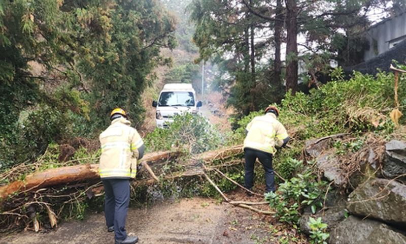 2일 제주도 소방안전본부에 따르면 이날 오전 8시 56분께 제주시 조천읍의 한 도로에 나무가 쓰러져있다는 신고가 접수됐고, 오전 8시 2분께 서귀포시 대정읍에서도 나무가 도로에 쓰러져 소방대원들이 각각 안전조치했다.