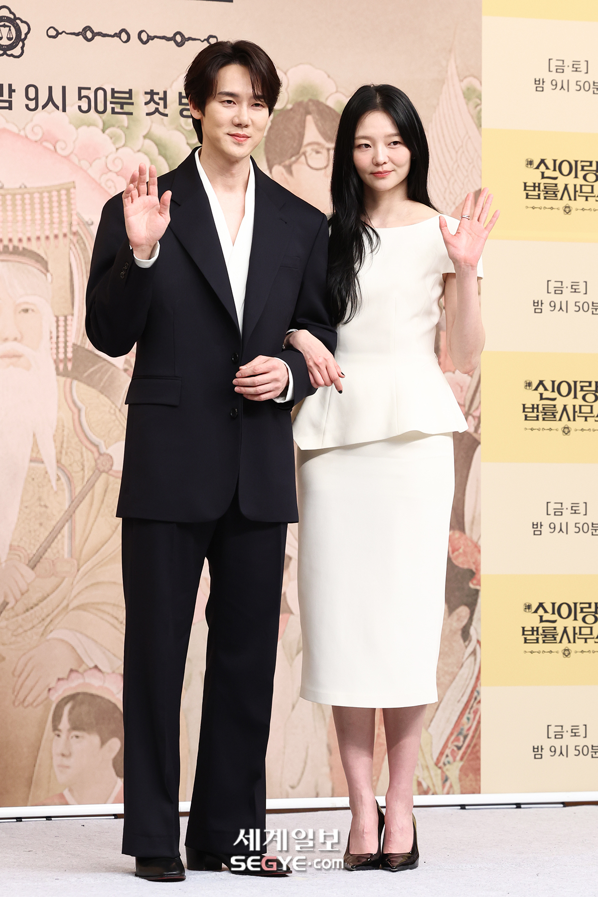 배우 유연석(사진 왼쪽)과 이솜이 11일 서울 목동 SBS에서 열린 새 금토드라마 ’신이랑 법률사무소’의 제작발표회에 참석해 포즈를 취하고 있다.