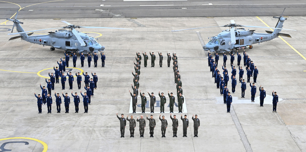 해군항공사령부 장병들이 신형 해상작전헬기 MH-60R 인수식을 하루 앞둔 지난달 31일 경남 진해 제62해상항공전대에서 MH-60R을 배경으로 대한민국 해양수호를 다짐하고 있다. 해군 제공