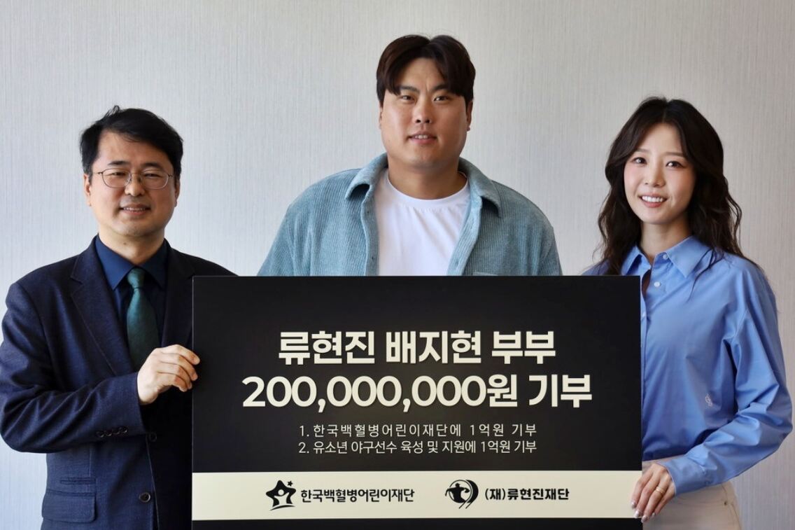최근 프로야구 최고령·최소 경기 1500탈삼진을 기록한 ‘코리안 몬스터’ 류현진(한화)이 부인 배지현 전 아나운서와 함께 프로 데뷔 20주년을 기념해 소아암 환아 지원과 유소년 야구 육성을 위해 2억원을 기부했다.