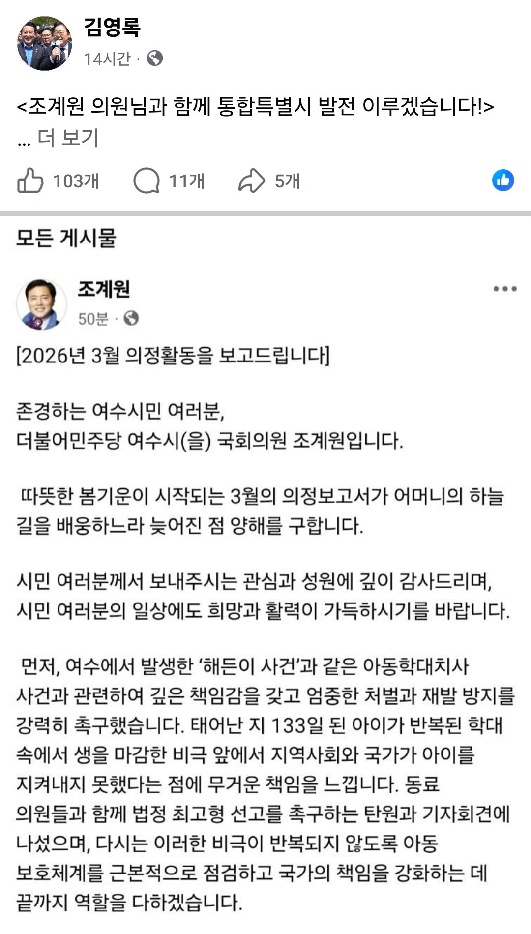 조 의원은 10일 자신의 사회관계망서비스(SNS)를 통해 “여수 발전을 위해 제안한 핵심 정책을 김 후보가 모두 수용했다”며 지지 입장을 밝혔다.