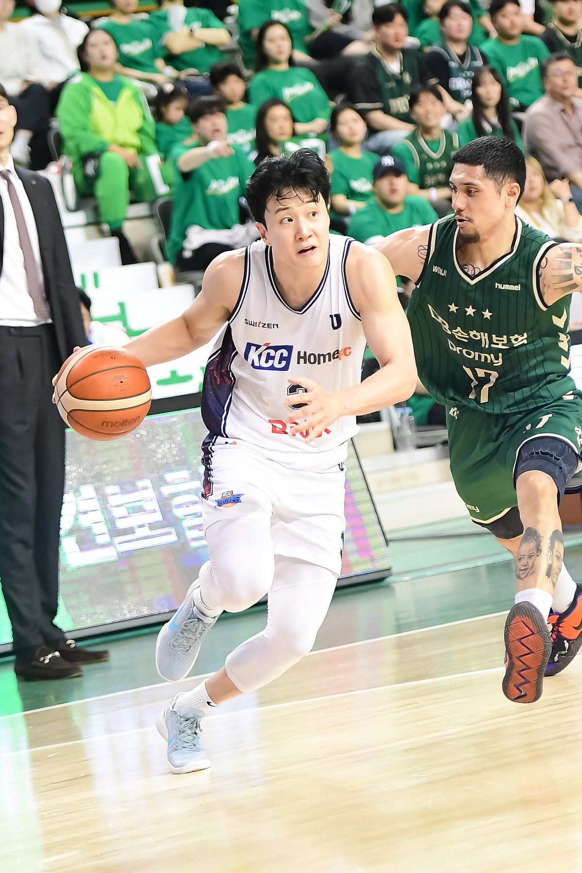 이날 경기는 초반부터 화력전 양상으로 전개됐다. 안방 사수에 나선 DB는 헨리 엘런슨과 이선 알바노라는 특급 외인 콤비를 앞세워 점수를 쌓아갔다. 여기에 정효근이 궂은일을 도맡으면서도 전반에만 9점을 몰아쳐 기세를 올렸다. 하지만 KCC에는 ‘더블더블’의 지배자 숀 롱이 있었다. 롱은 양 팀 최다인 26점 10리바운드를 기록하며 DB의 골밑을 초토화시켰다. 허웅과 허훈 형제 역시 외곽에서 지원 사격을 퍼부으며 화력 대결에 불을 지폈다.