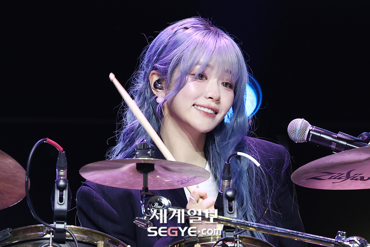 밴드 qwer 쵸단이 27일 서울 마포구 창천돈 예스24 원더로크홀에서 열린 미니 4집 ‘CEREMONY’의 쇼케이스에 참석해 열띤 공연을 펼치고 있다.
